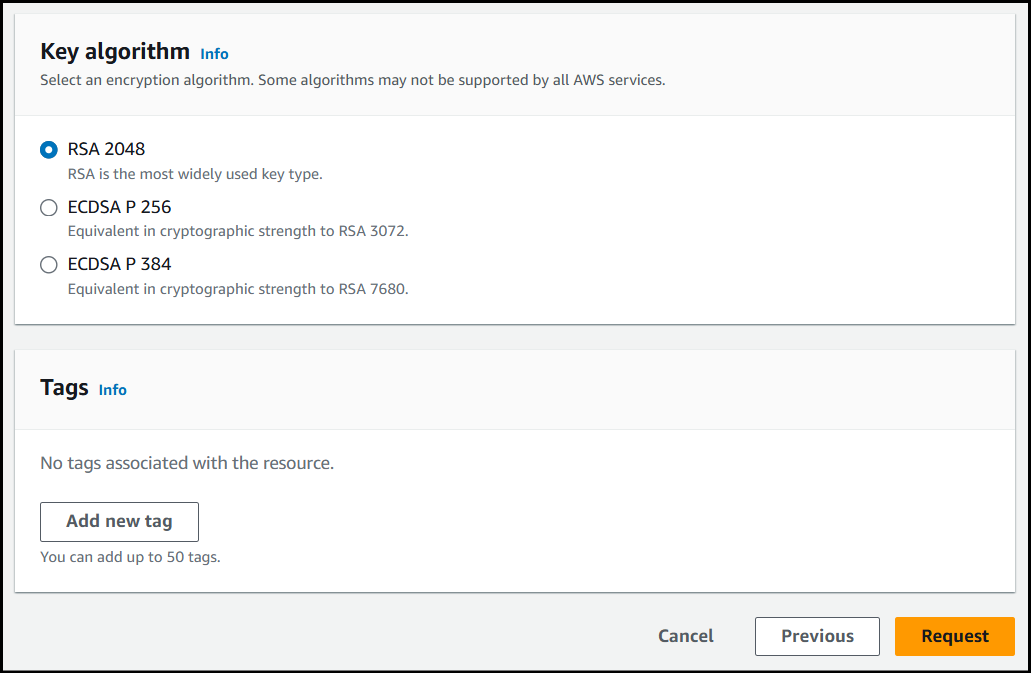 Select the Key algorithm you'd like to use for your cert and then click Request to create the certificate.