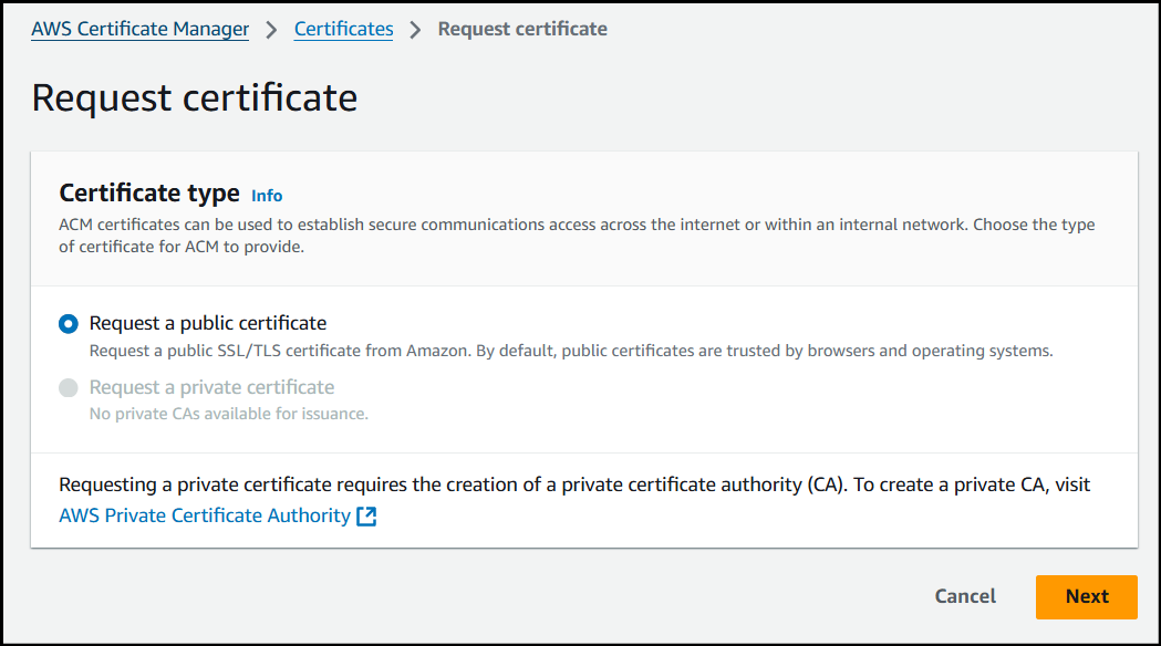 First, navigate to the AWS Certificate Manager service.