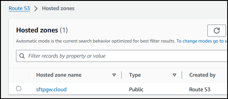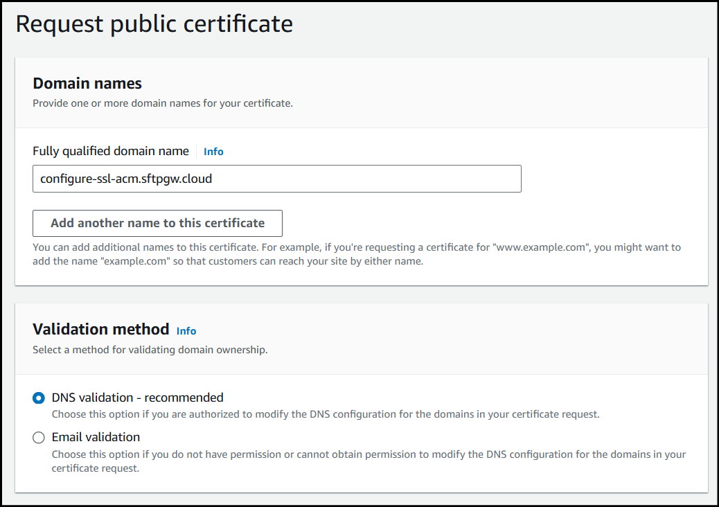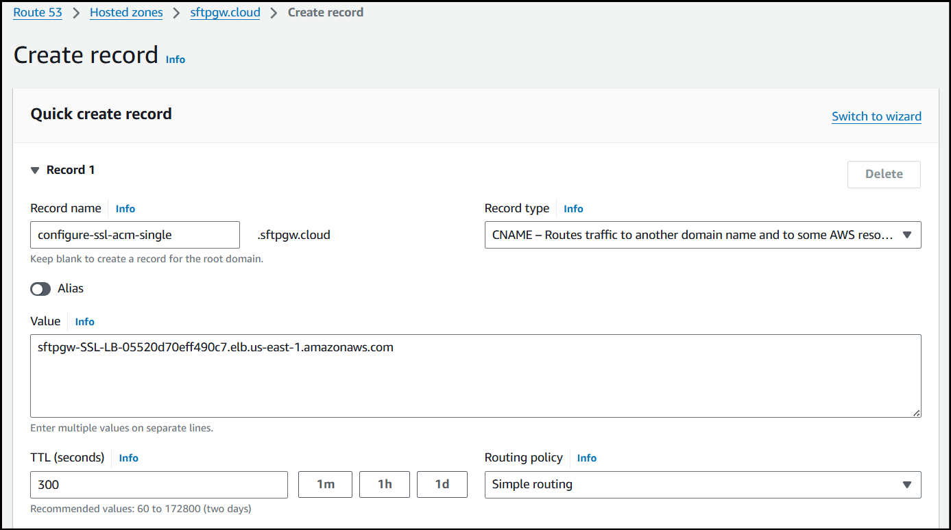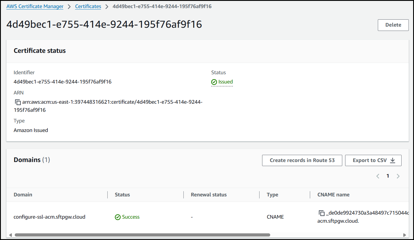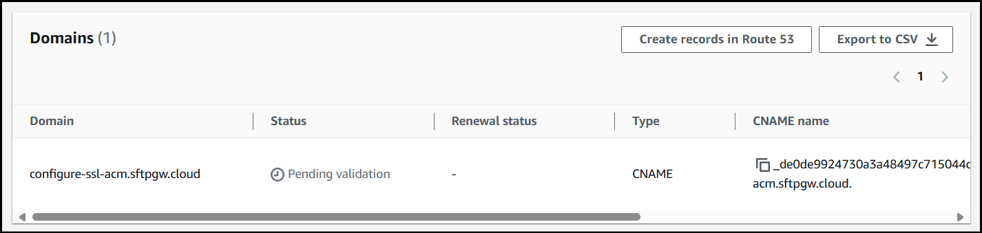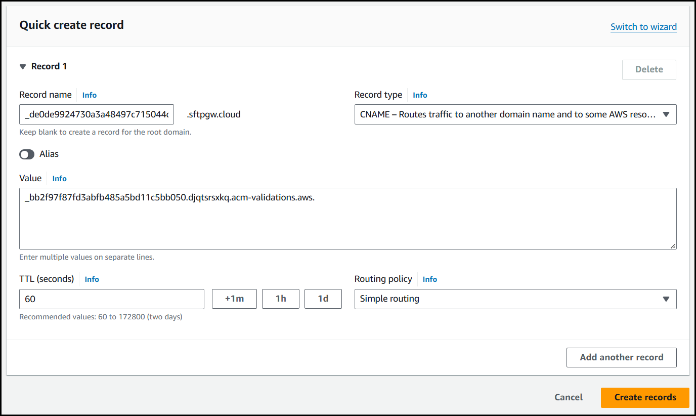 When creating the record name I just used _de0de9924730a3a48497c715044d0cc4.configure-ssl-acm since .sftpgw.cloud is already being appended to the end of the name.