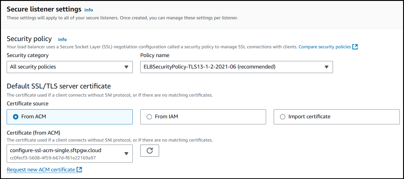 In the Secure listener settings section, set the Default SSL/TLS server certificate to the ACM certificate created in the first step.
