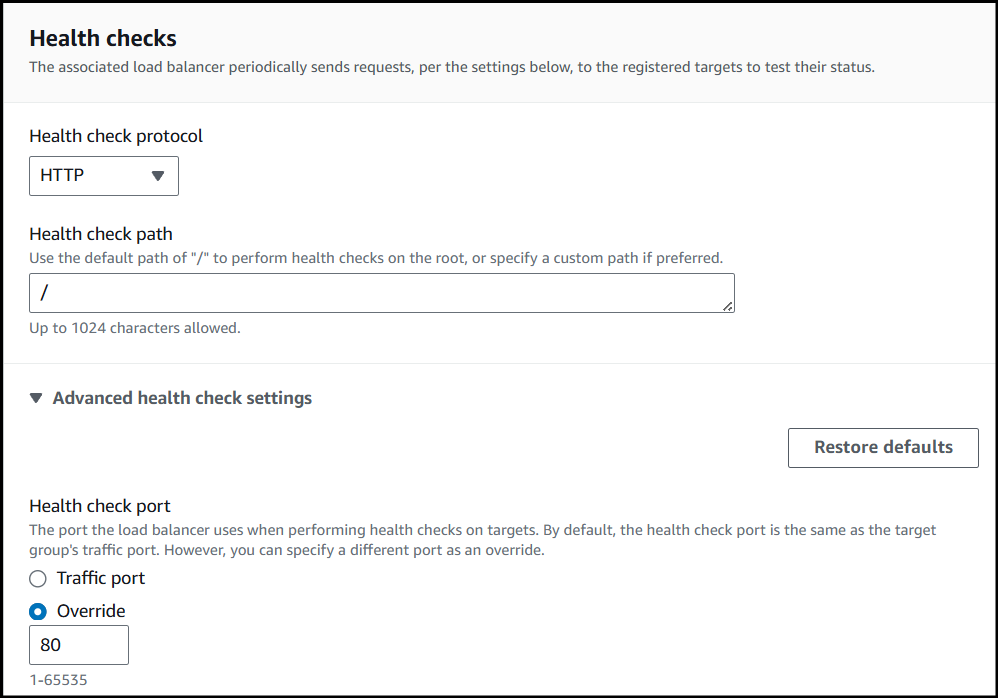 Set the Health check protocol to HTTP with a path of / and under the Advanced health check settings, change the port to 80.