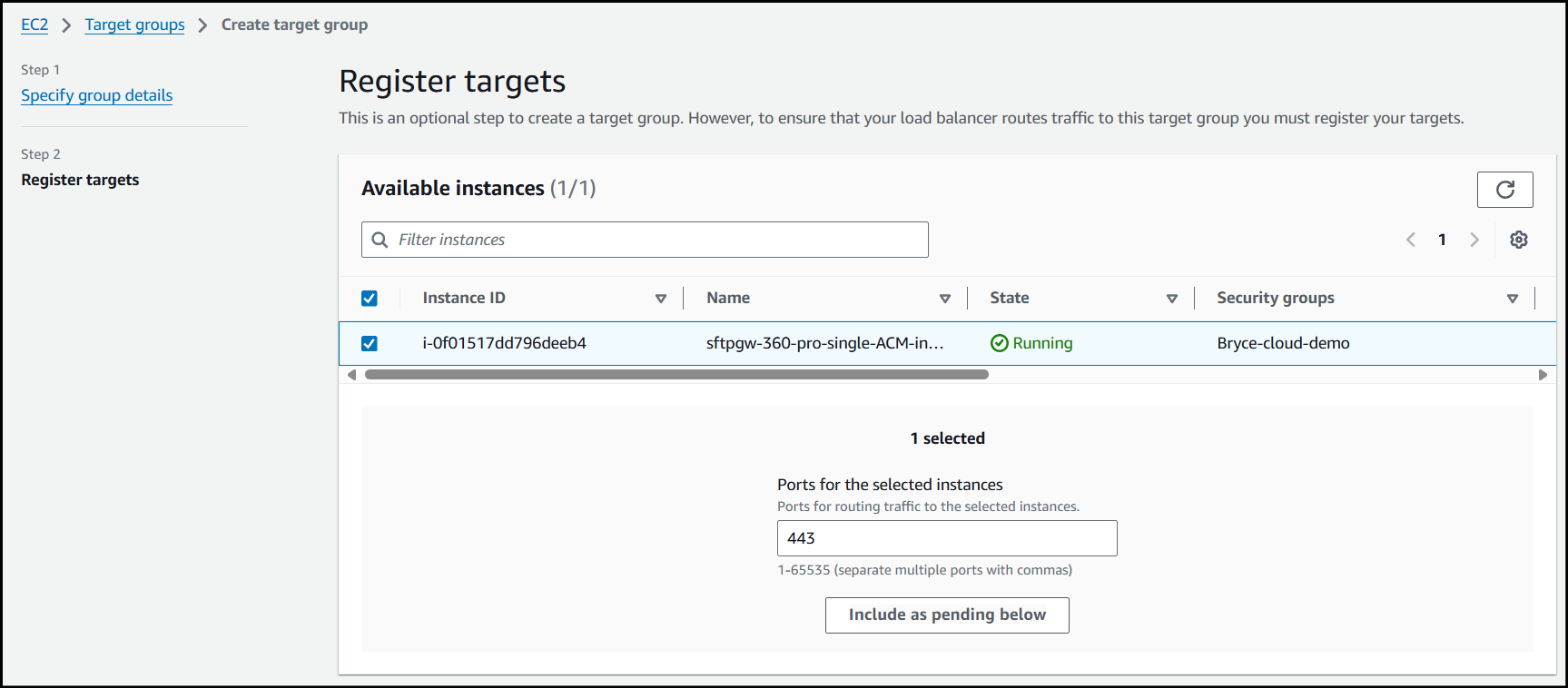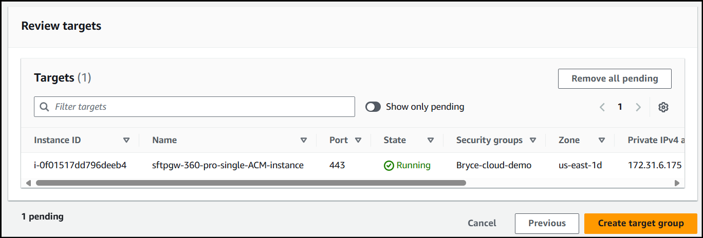 Verify the instance you've selected is the correct one and click Create target group.